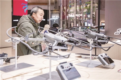 2月25日,记者走访市区永盛购物广场的大疆门店发现,店内人头攒动,众多市民前来咨询无人机和GoPro等拍摄设备。销售人员忙着向顾客介绍产品功能与使用方法,并现场演示无人机飞行操作。