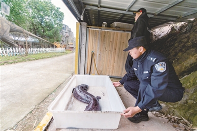 3月3日,在婺城区安地镇陆生野生动物救护中心,市公安局的民警把刚刚救助的国家二级保护动物大鲵交给救护工作人员。