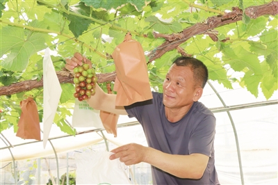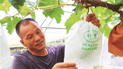 “这里用于育种的面积近28亩,其中,用于培育‘金之星’的有近8亩,用于培育‘彤玫瑰’的有5亩左右。”童洪升穿着雨鞋,走路大步流星,干起活来却细之又细。他查看现在还是绿色的“金之星”果穗的长势,为已经有部分上色的“彤玫瑰”套袋,忙得一丝不苟。“照这样的长势,‘彤玫瑰’6月底就能收获,‘金之星’7月底就能收获。”他欣喜地说。