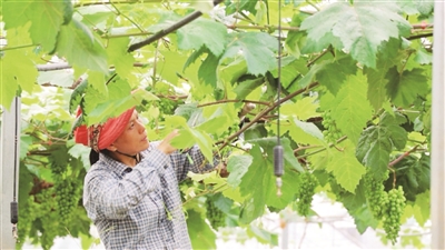 六月的阳光洒落葡萄育种基地,连片葡萄园果香渐浓。步入其中,一串串葡萄颗粒日渐饱满,长势旺盛。