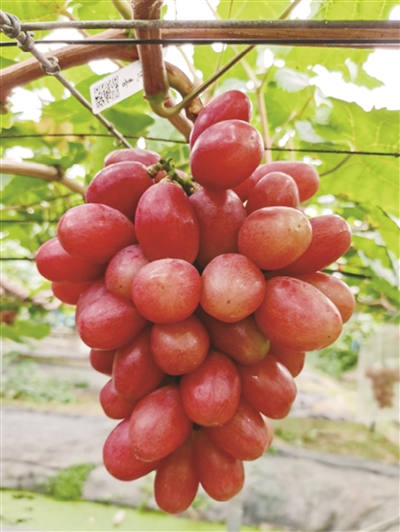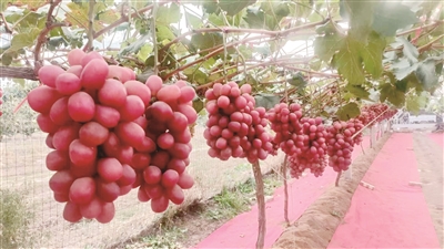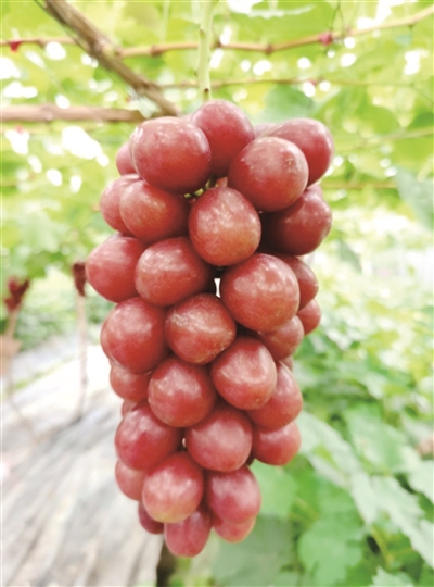 “金之星”尚未成熟,童洪升用手机展示了一张图片。只见成熟的葡萄呈红色,果粒大、颜值美,犹如红玛瑙般让人赏心悦目,不由得让记者大吃一惊。“‘金之星’在山东、陕西、山西等省种植表现特别好,果粒大、甜度高、硬脆多汁,也广受消费者好评。”童洪升说,基本上每到收获季节,“金之星”葡萄都是供不应求。