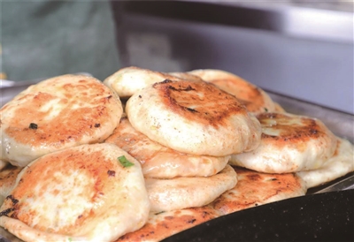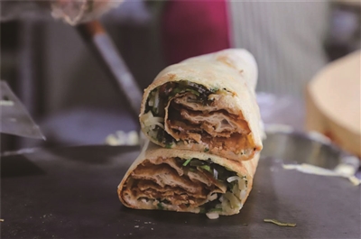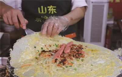 五谷杂粮摊成的薄饼,在铁板上跳着欢快的舞蹈。老板娘手法行云流水,打蛋、撒葱、抹酱、夹脆饼,最后“嚓”的一声利落对切。一个完美的山东杂粮煎饼就做好了。刚出炉的煎饼散发着杂粮的醇香,薄脆与秘制酱料搭配得刚刚好,这份街头美味总能让人念念不忘。