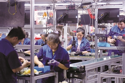 8月6日,在婺城区白龙桥镇的浙江开创电气股份有限公司生产车间内,流水线上的工人们正专注地组装着手持式电动工具整机。