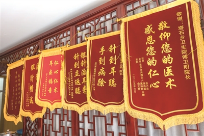 心里装着百姓的病痛,两脚才不畏山高路远。数十载如一日,傅卫明像一棵大树扎根大山深处。9月11日,塔石乡卫生院内人头攒动,除了当地百姓,还有从金华周边乃至全国各地赶来的患者,大家都是冲着傅卫明来的。天蒙蒙亮,有的患者就早早来到卫生院门口等候了。墙上,挂满了患者送给他的锦旗。