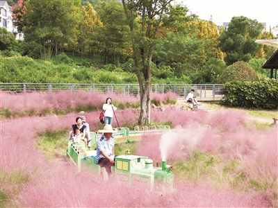 乘坐复古小火车可穿梭花海,沉浸式观赏这份秋日限定美景。栈道上,游客们或驻足拍照,或漫步赏花,记录这份梦幻景致。